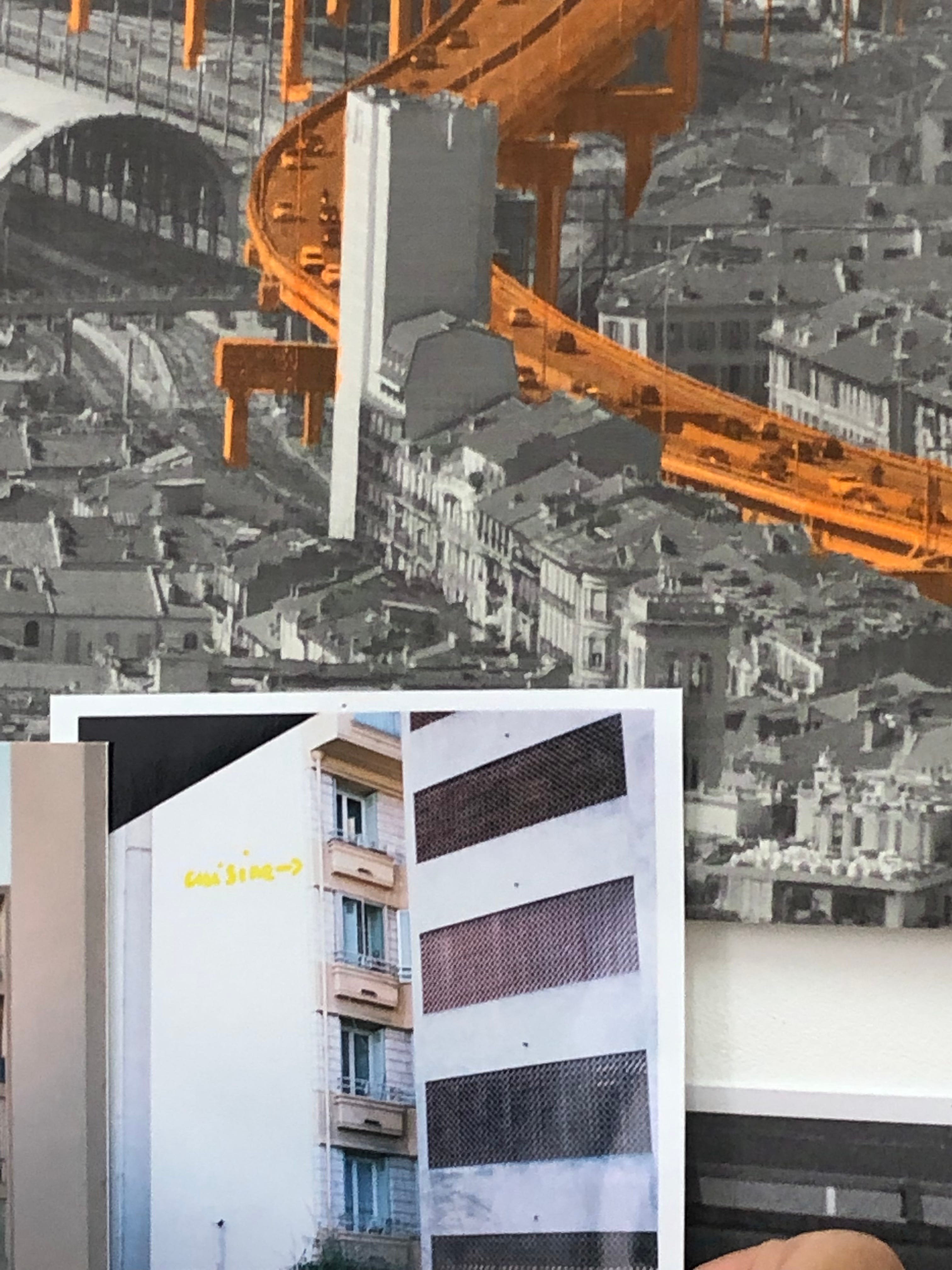 Le projet urbain de l’époque mise sur la voiture, l’ouverture de la route à tous et la création de nouveaux lieux pour ceux qui rentraient à contrecœur de l’Algérie. Le tracé de la route forme une espèce de cicatrice à travers la ville, où elle serpente entre les bâtiments, comme un fleuve ; aérienne, elle monte jusqu’au cinquième étage de certains immeubles (une partie est fermée la nuit, pour les laisser dormir). Nice est encaissée entre la mer et les collines : on a choisi, pour préserver la nature alentour, de concentrer cet ouvrage “pas laid, mais envahissant” dans la ville elle-même, de miser sur la voiture et sur la route pour désengorger la ville. L’autoroute, pour le moment, se déverse dans une petite rue. Cet ouvrage raconte l’histoire d’une certaine idée de la Méditerranée, de Nice à Gênes (où l’A10 s’est effondrée en 2018). Soixante ans plus tard, ses toboggans démontables, qui n’étaient pas pensés pour durer, sont, en fait, toujours là. Le long de la route, les photos d’Amandine montrent une école privée et une école publique, des jardins et des parcs à chien collées en lisière de la route, avec une végétation luxuriante, notamment du lierre, qui surprend un peu. Comment les habitants du centre ville, avec leur vue sur la mer, ont-il accepté le tracé et ce nouveau bruit de fond, puisque leurs maisons et jardins étaient déjà là ? Que reste-t-il du grand projet, un demi-siècle après ?